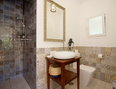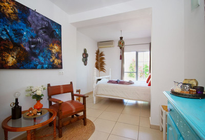 The single-story building was designed with rental optimization and the guest experience in mind. It features two master bedrooms with separate entrances from the garden, each with en-suite bathrooms, plus a third bedroom in the main house. It also features a separate studio with a bedroom, en-suite bathroom, kitchen, and separate living room, ideal for additional accommodation or exclusive services. A very private porch completes the whole experience, allowing guests to perfectly enjoy the surroundings.
