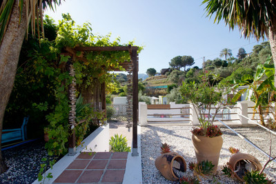 The outdoor area is a true oasis: a southeast-facing pool, a hot tub, and several terraces for sunbathing, relaxing, and admiring the breathtaking views. The garden is landscaped to provide a corner for reading or relaxing. Various tree species grow on the property, including citrus, lemon, and orange trees, creating a natural and inviting atmosphere that delights visitors. The property also features parking for several cars and a storage room for additional household items, simplifying management and ensuring guest comfort.