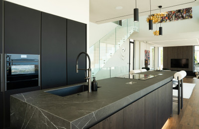 The open-plan layout is enhanced by top-quality materials, smart home technology, individual air conditioning/heating, and a private elevator connecting all floors.