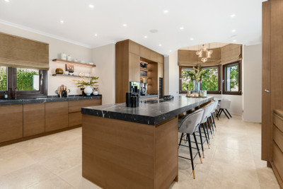 The interior of the home is equally impressive, with the main living room showcasing vaulted ceilings that create a sense of grandeur. A spacious dining area and a second living room provide ideal spaces for both formal and casual gatherings. The kitchen is equipped with high-end Gaggenau appliances, ideal for culinary enthusiasts. Stepping outside, the villa opens to an expansive terrace with a stylish lounge area, seamlessly connecting to the heated swimming pool. The south-facing orientation ensures an abundance of natural light throughout the day. This stunning villa also features a beautiful barbecue area, perfect for outdoor dining and entertaining while enjoying the spectacular views.
