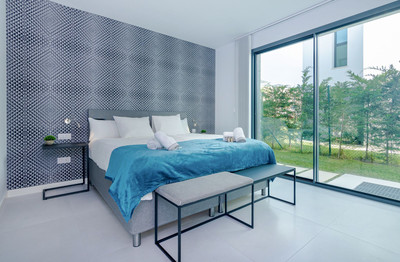 The ground floor features a bright open-plan living and dining area with a luxury Siemens-fitted kitchen, plus two guest bedrooms with en-suite bathrooms, guest toilet. Large sliding doors lead to the south-facing garden and terraces, complete with outdoor dining area, lounge seating, gas barbecue, and beautifully maintained garden.