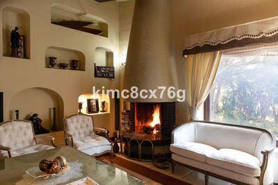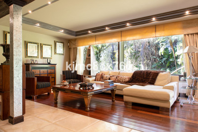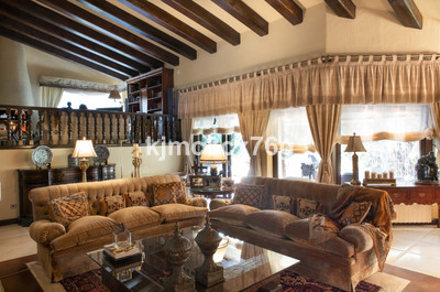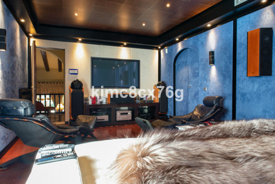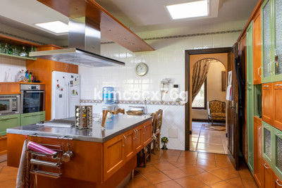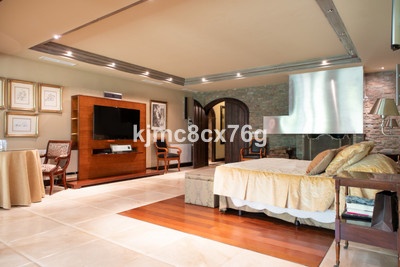 The house is divided into levels. From the entrance hall on the main floor we access the large living room with fireplace, very cosy, large and spacious, with high ceilings that give a feeling of openness. This is the heart of the house, as from here we can access different areas. Large kitchen with peninsula, toilet and exit to the main terrace, partially covered. A short flight of stairs leads down to the cinema room as well as to several bedrooms and bathrooms, including a very large storage room. On the lower level there is a huge master bedroom with dressing room, bathroom ensuite, fireplace and lounge. There is also an office, wine cellar and another bedroom, for a total of 7 bedrooms in the villa.