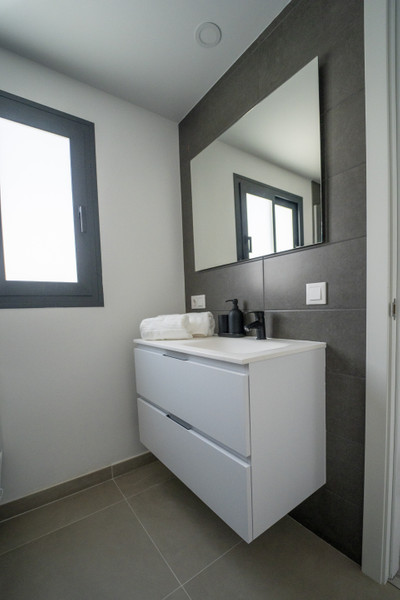The ground floor boasts a spacious living area that opens directly onto a private terrace, ideal for relaxing or entertaining guests. The contemporary kitchen is fully integrated into the living space, and there's also a separate laundry area equipped with a washing machine and dryer for added convenience. The home offers a total of three bedrooms and two bathrooms, designed to comfortably accommodate families, couples, or groups.