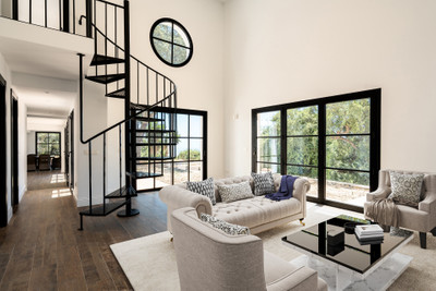 The villa offers 250 m² of interior space, complemented by a separate 30 m² guest studio. The interiors are bright, understated and thoughtfully finished, with a distinctly Scandinavian feel. On the ground floor there are two bedrooms with bathrooms, while a sculptural spiral staircase leads upstairs to an additional en-suite bedroom and an impressive principal suite framed by panoramic windows.
