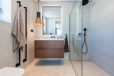 The entry level features a spacious lounge and an open-plan designer kitchen with floor-to-ceiling windows that frame the stunning mountain scenery. From here, the living spaces extend naturally toward the meticulously landscaped garden and the heated saltwater infinity pool. This level also includes a generous guest suite with an en-suite bathroom, as well as a stylish guest toilet.