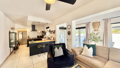 Set on a nearly 300 m² private garden plot, the home is just a short walk to the picturesque El Faro beach,