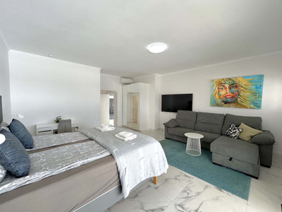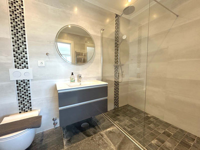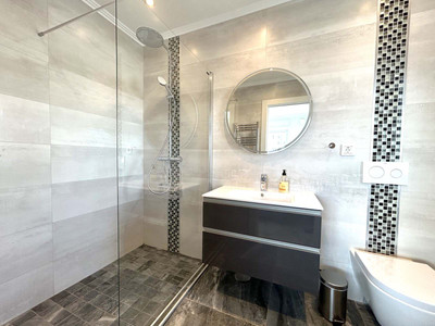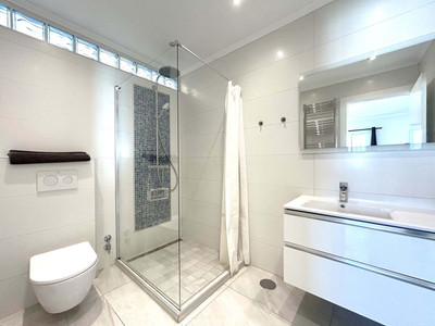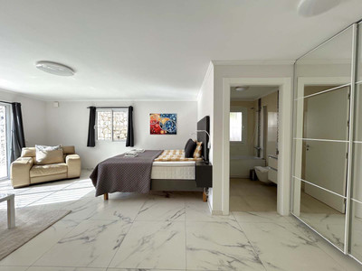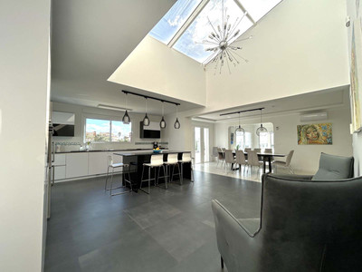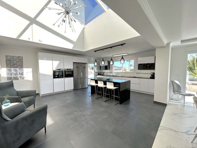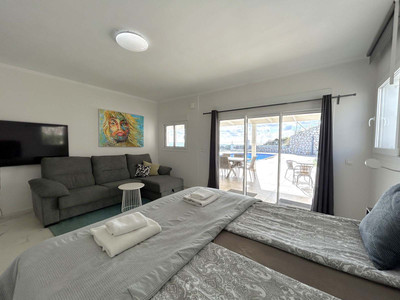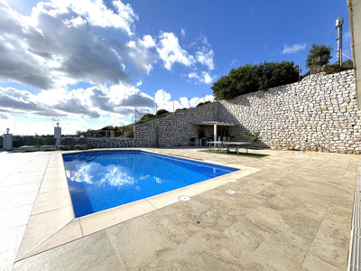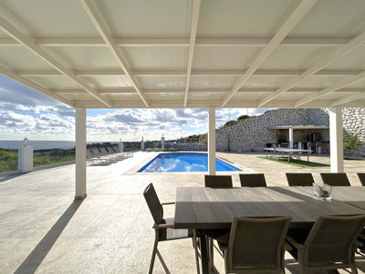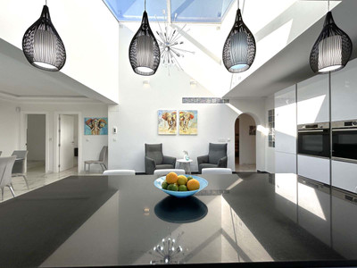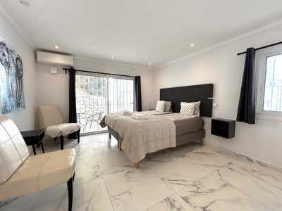 The spacious villa features six bedrooms, each with an ensuite bathroom, a fully equipped kitchen, and a separate guest apartment with its own kitchen, bedroom, bathroom, and living room. Outdoor spaces include large terraces, gardens, a solarium, a heated pool, and an outdoor dining and barbecue area. The villa also boasts air conditioning, underfloor heating, and solar panels for power and water heating.