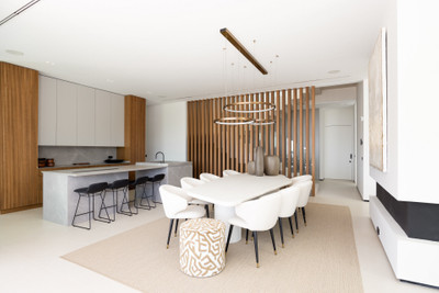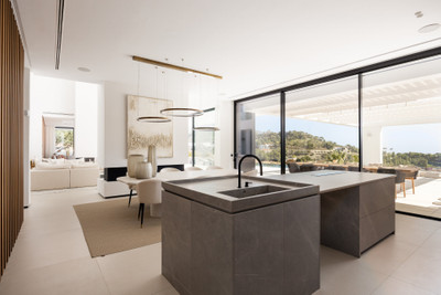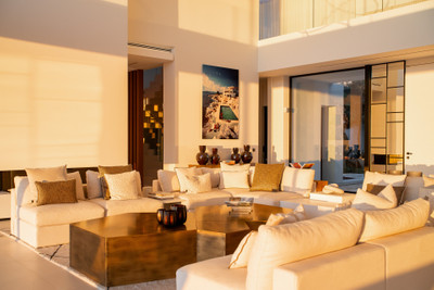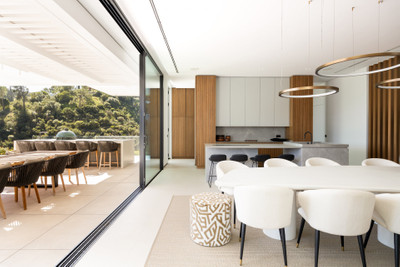 Thoughtfully designed to embrace its surroundings, the villa centers around a light-filled open-plan living space where panoramic mountain and sea views take focus. A striking entrance leads into a spectacular double-height living area, seamlessly connected to an elegant lounge, formal dining space, and a sleek designer kitchen. A beautifully appointed guest suite completes this level. Expansive floor-to-ceiling windows open onto generous terraces and a stunning infinity pool, creating a seamless indoor-outdoor flow and allowing the views to be enjoyed from every angle.