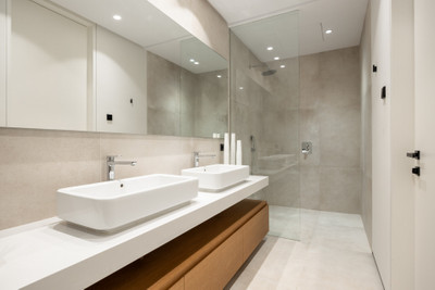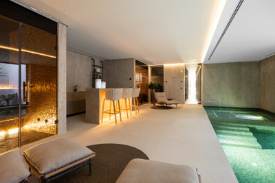 The lower level is designed for leisure and wellness, offering an impressive private spa with a heated indoor pool, sauna, hammam, and a fully equipped gym. This floor also features a stylish bar, perfect for entertaining. In addition, there are two further guest suites and a fully self-contained apartment with its own living room, fully equipped kitchen, bedroom, and bathroom—creating a private and versatile space ideal for guests