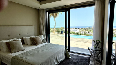 This exquisitely crafted contemporary villa situated within a gated community presents breathtaking sea views and an open-concept living space filled with natural light. The floor-to-ceiling glass windows lead out to the terrace.