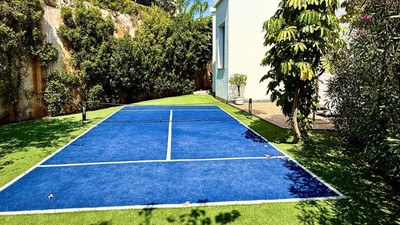 Outside, the villa features a private pool, perfect for sunbathing and taking in the spectacular vistas. The meticulously maintained garden offers a tranquil atmosphere, while the mini tennis court introduces a playful and active aspect to the property.