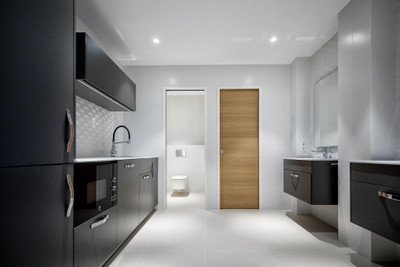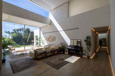 A sculptural staircase leads to the upper floor, where a guest suite with an adjoining bathroom, an office, a dressing room, and access to the terraces await, providing a private retreat for guests or residents seeking a quiet workspace. The basement is designed for functionality and entertainment, offering a spacious garage with room for up to six cars, as well as utility and storage spaces. Entertainment rooms in the basement expand options for leisure, making it the perfect space for gatherings and personal enjoyment.