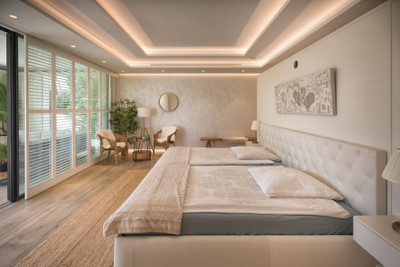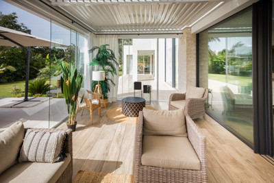 Complementing the main residence is a 500 m² guest house designed with the same level of luxury, featuring two bedrooms with dressing rooms and en-suite bathrooms, a spacious living area with a modern kitchen, a private terrace, and its own pool. This addition ensures privacy for guests or can serve as staff accommodation, making it a versatile extension of the property.