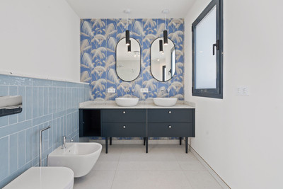 There is underfloor heating throughout the entire house, as well as new 5 system A/C, and a pellet fireplace in the living/kitchen area.