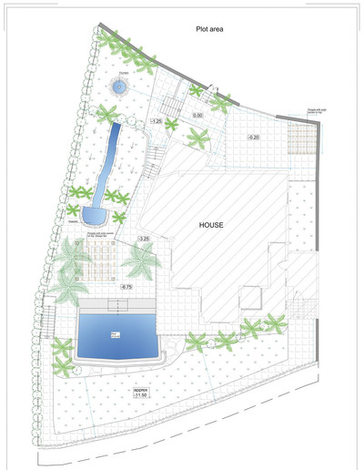 The lush garden will be full of bamboo, palm trees, a waterfall and a marble fountain. The garden is equipped with an irrigation system. The garden (and the outside) of the house will be beautifully lighted.