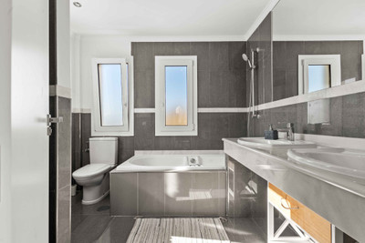 The upper floor features an impressive master suite, as well as two spacious guest bedrooms and an additional bathroom. Each bedroom has its own private terrace to enjoy incredible views of the golf course and mountain range in the background. This floor also leads to a private roof terrace with amazing 360-degree panoramic views of the sea and mountains.