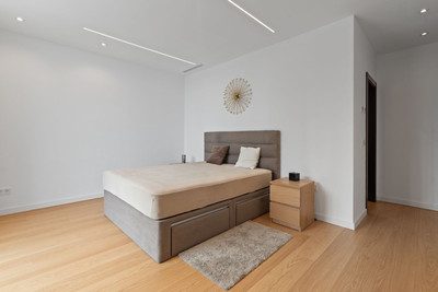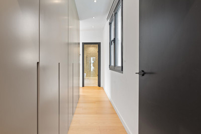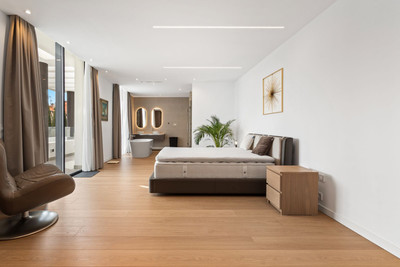 The main living level is open and well connected, with a large lounge, dining area, and a fully fitted designer kitchen, equipped with premium Gaggenau and Miele appliances. This floor also includes two en-suite bedrooms, both with direct access to the outdoor areas. Large floor-to-ceiling windows bring in natural light and create a seamless flow between indoor and outdoor spaces.