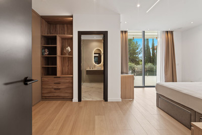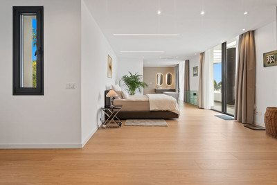 The property has a total built area of 980 m², along with 152 m² of terraces. Its south-west orientation allows sunlight throughout the day and opens up views across the golf course, gardens, and surrounding mountains and sea. Inside, the villa features five spacious bedrooms and seven bathrooms, all finished to a high standard.