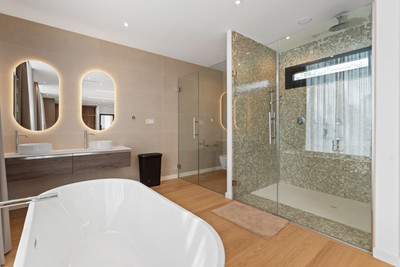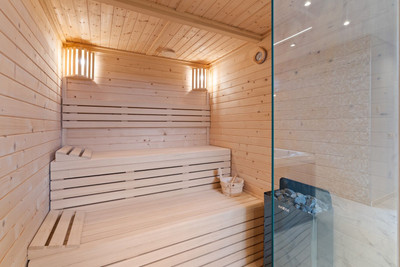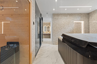 The lower level is designed for both comfort and leisure, offering a private gym and spa area with sauna, jacuzzi, and hammam, along with entertainment spaces, staff accommodation, storage, and utility rooms. The villa is equipped with underfloor heating, advanced climate control, double glazing, and a fireplace. Energy efficiency is enhanced through photovoltaic solar panels with FVE battery system and solar water heating.