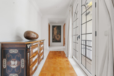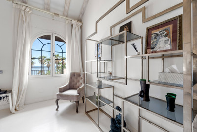 The first floor hosts the impressive master suite with private lounge area, two dressing rooms and breathtaking sea views. Five further bedrooms complete the upper level. A 600 m² basement provides parking for up to ten cars and includes staff accommodation. The mature gardens surround a large swimming pool and open directly to the beach.