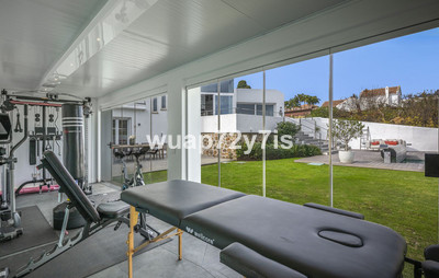The house is located on a large plot with a private swimming pool and an open view of the green area, without dense development in front of the house, which creates a feeling of space and tranquillity. An additional room with a separate entrance is attached to the house, which can be used as a guest room or study, or, if desired, combined with the living room to increase the main living space. There is a separate gym of 50 m² on the plot.