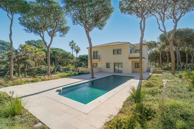 This bright detached villa offers an abundance of privacy surrounded by many mature pine trees and set within a 2,850 m2 landscaped garden, very attractively designed including a swimming pool, large terrace and barbecue area and boasts many spacious, sunny terraces.