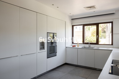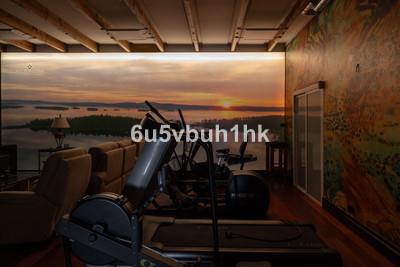 The ground floor includes four additional bedrooms, each with direct access to the landscaped garden and the inviting, heated pool. Adjacent to the pool, a Finnish sauna provides a perfect spot for relaxation. This floor also includes a massive gym with its large mural depicting Lake Inari in Lapland, and a large garage for convenience.