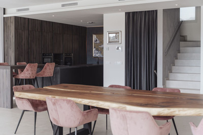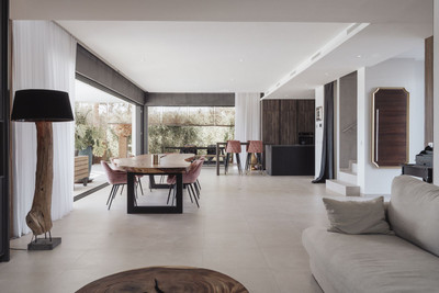 The heart of this stunning home is undoubtedly its open-plan living area, which seamlessly integrates the living, dining, and kitchen spaces into one cohesive and inviting environment. This area opens out onto large terraces, offering breathtaking views and creating an ideal setting for alfresco dining or simply enjoying the beautiful surroundings.