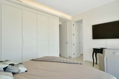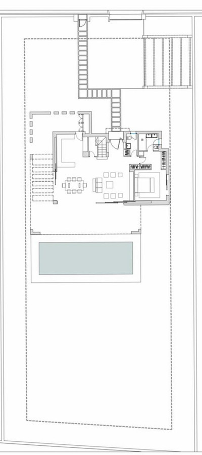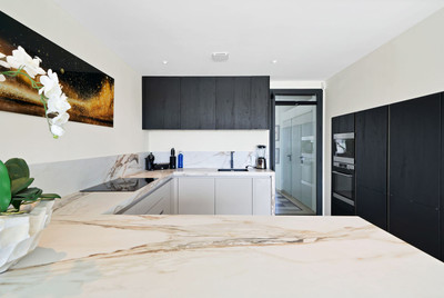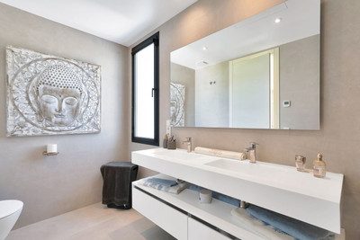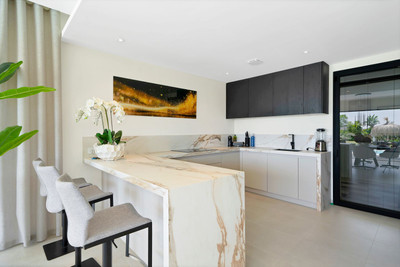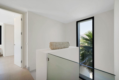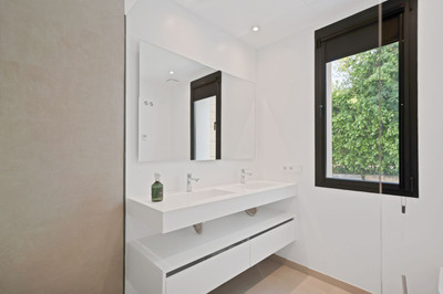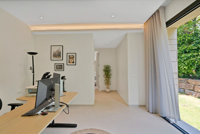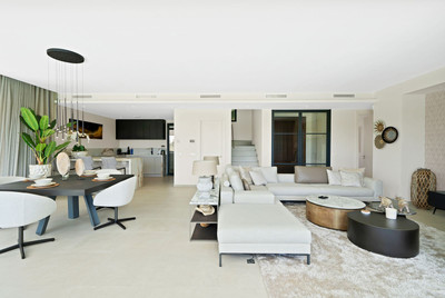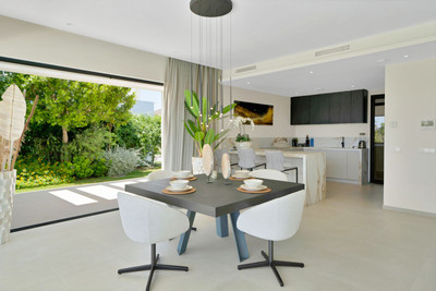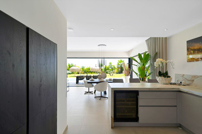 The ground floor boasts a stunning open plan living area, Through the impressive wooden front door which is both wide and tall, one enters the living room area, where the immediate impact of space and light create the feeling for this fabulous la Cala Golf villa. Floor to ceiling high quality patio doors flank all of the walls and are designed to slide delightfully into the walls, allowing that the interior open plan living space blends into the perfect alfresco experience by incorporation with the south-facing terrace. This terrace is further improved with the addition of glass curtains, meaning that come rain or shine, the outdoor space of this property is to be enjoyed, with the lovely views of the green and verdant gardens and the countryside beyond.