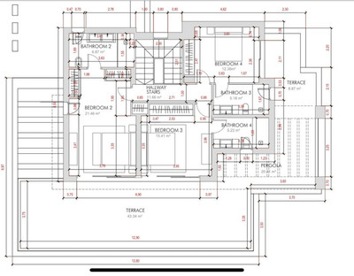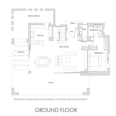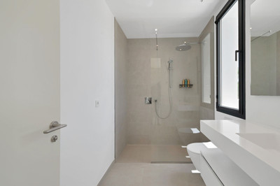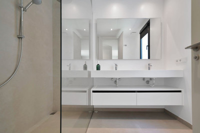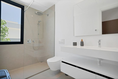 This villa is built over 314 square meters. It has the original configuration of the villas, with one bedroom and ensuite bathroom on the ground floor, and 3 bedrooms each with it's own bathroom on the first floor.