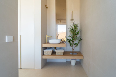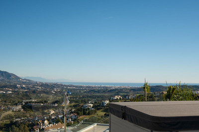 The first floor hosts a spectacular master bedroom with two walk-in wardrobes and a luxurious en-suite bathroom. There is also a second en-suite bedroom. An exterior staircase takes you up to the dream-like solarium, featuring a jacuzzi and outdoor lounge area, where you can soak up the sun all day and admire jaw-dropping views.