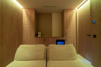 The lower floor includes a second lounge with access to the outdoors, three bedrooms, two bathrooms, a home cinema, sauna, Turkish bath, and gym area. All floors are connected by a glass elevator (to be installed).
