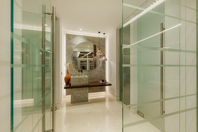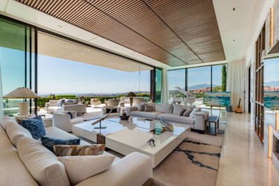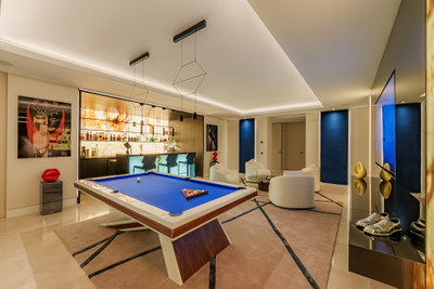 At the heart of the home lies a breathtaking living area, defined by soaring ceilings and full-height glass sliding doors that seamlessly disappear into the walls, blurring the line between indoors and out. The natural light floods the space, accentuating the fine finishes and drawing the eye out to the expansive terraces, tranquil garden, and infinity pool beyond. This open-concept layout creates a fluid connection with the outdoors, offering an inviting atmosphere for both intimate moments and large-scale entertaining.
