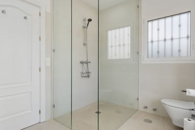 Stepping through the wooden doors, you are welcomed into an exquisite foyer adorned with a staircase and lofty ceilings. To the left, the first bedroom awaits, boasting a double bed and an ensuite bathroom. The second bedroom, adorned with two single beds, also offers its own ensuite bathroom. On this floor there is also a guest toilet. On the opposite side, the kitchen and dining area beckon with expansive glass windows, seamlessly merging indoor and outdoor living. Accessible from here is the capacious covered terrace, complete with a dining table and inviting lounge area perfect for gatherings on those hot and sunny days.