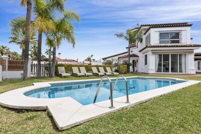 Nestled in the serene Las Chapas Playa, 300 meters from the sandy shores, awaits a stunning 5-bedroom, 6 bathroom villa. This idyllic property is conveniently situated just a 5-minute drive from Marbella Centre and a 40-minute journey from Malaga Airport, ensuring both accessibility and tranquility.