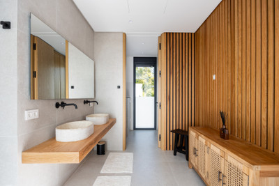 Occupying an elevated position, the villa enjoys breathtaking, uninterrupted panoramic views of the sea from every level, while its southern orientation ensures abundant natural light throughout the day. The property offers four expansive en-suite bedrooms and seven designer bathrooms, each guest suite enjoying complete privacy and luxurious finishes. Comfort is paramount, with water-based underfloor heating throughout, complemented by an advanced Airzone climate system and full smart home integration.