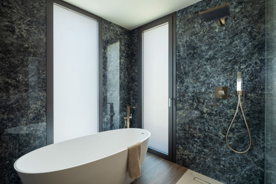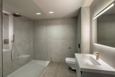 The interior is defined by its modern design and exceptional craftsmanship, featuring a polished concrete staircase with button glass balustrade, and Q-Rail glass systems enhancing the terraces. Bathrooms are fitted with sleek Hansgrohe rain showers, porcelain built-in shower trays, and wall-mounted WCs with concealed cisterns—all designed for a clean, contemporary aesthetic.
