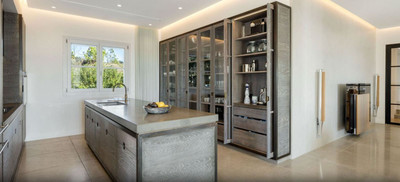 Upon entering, you are greeted by an expansive lounge featuring a sleek glass fireplace that frames stunning views of the 113 m² pool, manicured gardens, and the Mediterranean Sea. The pool area has been enhanced with premium features, including a heated system, electric cover, and solar panels dedicated to water heating, ensuring year-round enjoyment with exceptional energy efficiency. Adjacent to the main living space, a private TV room and a sophisticated formal dining area provide ideal settings for both relaxation and entertaining.