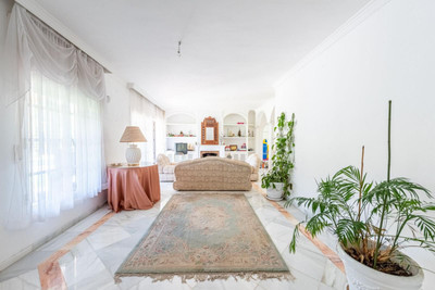 Beautiful villa in the Xarblanca area, close to all amenities and a 5-minute drive from the center of Marbella. It comprises a 1,100 m² plot with a very large garden surrounded by plants and palm trees throughout the house, and a large swimming pool. The house itself is 412 m² and is distributed as follows: