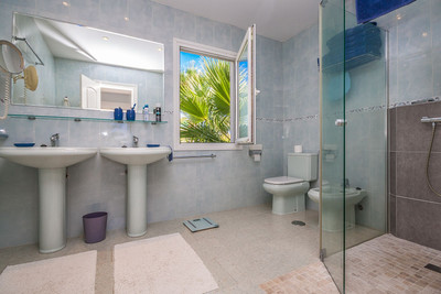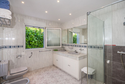 Furthermore the property is equipped with air conditioning, central heating and double glazing with shutters and mosquito nets, ensuring convenience and efficiency throughout the seasons. Outdoors, the property features a beautifully matured garden with automatic irrigation system, offering full privacy. A heated swimming pool with an electric cover, multiple terraces with various seating areas and a small outdoor kitchen create the perfect setting for Mediterranean living. Additional features include a private well with a 12.000 Liter water deposit and a garage for 2 cars with electric gates. A true gem in the sought-after Marbesa area, this villa combines charm, functionality, and luxury—ideal as a family residence or holiday retreat.