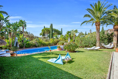 Luxury family villa in MARBESA, one of the most exclusive areas of Marbella. A desirable large open-plan villa on a flat south-west facing plot with mature landscaped gardens and large heated pool, and with wonderful panoramic sea views, only a few minutes walk to the beach, and close to Elviria and pretty Cabopino port.