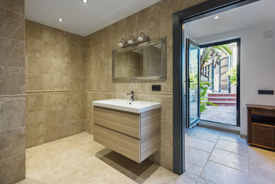 On the ground floor, a grand entrance hall with guest WC leads into a vast open-plan dining and living area. To one side is a fully fitted modern kitchen with high-end appliances including two ovens, two fridges, two freezers, induction cookers, dishwasher, microwave, and a special tap for filtered drinking water, with direct garden access. On the other side, patio doors open to a large terrace with glass curtains, perfect for enjoying sunrise and sunset year-round. The elegant living room features coloured LED ceiling lighting, direct terrace access, and a lift to the rooftop jacuzzi. The master suite on this floor boasts a wraparound terrace, a luxurious walk-in closet with central island, and an en-suite bathroom with balcony—ideal for soaking in a hot bath while watching the sun set over the Andalusian hills.