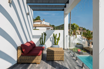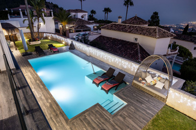Spectacular villa that perfectly blends Mediterranean style with contemporary design, combining traditional charm with modern comfort and top-quality finishes. Located in the prestigious Buena Vista area of Mijas, it offers a unique lifestyle in a peaceful and private setting, with stunning panoramic views of the Mediterranean Sea, the coastline, Africa, and the mountains. Set on a plot of 800 m² with a built area of 251 m², the property is in immaculate condition and ready to move into. Its location is unbeatable: just 5 minutes from Fuengirola, 2 minutes from the exclusive Higuerón commercial area with all kinds of services, 10 minutes from the finest beaches of the Costa del Sol, and only 20 minutes from Málaga city center and the airport. The villa is mainly distributed on one floor, ensuring functionality and comfort. Upon entering, the home immediately stands out for its brightness and sense of space thanks to the open-plan design. The modern fully fitted kitchen seamlessly integrates with the spacious living room with fireplace, creating a warm atmosphere that connects with the terraces and garden through large sliding doors. The exterior is a true private retreat, featuring a swimming pool with sunbathing area and hydromassage jet, a barbecue area ideal for outdoor gatherings, and a landscaped garden with fruit trees, all with open views to the sea and mountains. The property offers four bedrooms. The master bedroom, with en-suite bathroom and walk-in wardrobe, has direct access to a terrace with a private jacuzzi. Two additional bedrooms with their own bathrooms are located on the opposite wing of the house, ensuring privacy for family or guests. On the upper floor, a versatile space currently used as a gym with bathroom and private terrace can easily be converted into an independent suite with spectacular views. Additional features include a cinema room, sauna, laundry room, air conditioning, solar panels for hot water, and parking space for three vehicles, including a closed garage and covered carport. An ideal residence both for year-round living and as a luxury holiday home, perfect for those seeking privacy, comfort, and a strategic location on the Costa del Sol.