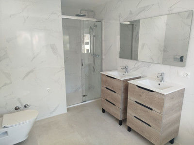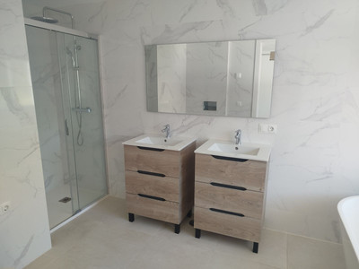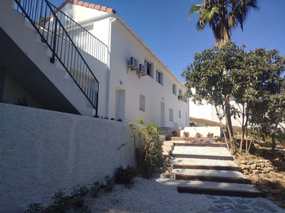 Totally renovated to a high standard and insulated with thermal insulation,you have this luxury 4 bed 4 bath villa in a quiet street in Campo Mijas with landscaped terraced gardens electric gated secure parking electric entrance gate with video entry. There are two large terraces with one surrounding the newly constructed pool. The house has two separate levels with the living room / dining room modern open plan kitchen , 2 large bedrooms both with ensuite shower and bathrooms with under floor heating and guest toilet on the entrance level with another independent bedroom with ensuite showerroom plus a large studio apartment with ensuite and storeroom on the lower level, electric blinds all water electric sewage pipes and wires are new, easy local access to all the bars restaurants of El Coto and Fuengirola set a very quiet area with video entrance and fully alarmed .