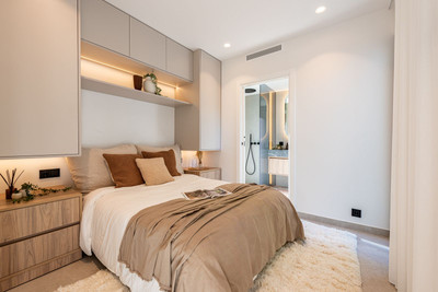 The villa offers four bedrooms, all with en-suite bathrooms, giving each family member their own comfort zone. Every bedroom is equipped with individual central AC (hot/cold) for personalised climate control. The master suite includes a makeup area, a spacious bathroom with both shower and bathtub, and a private view of La Concha — a subtle reminder each morning of where you live.