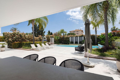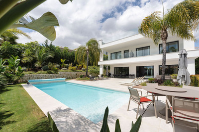 Welcome to this modern and very well built house in the lower Nueva Andalucia area. As you enter you are greeted with a large open kitchen that leads to the dining and living area, from here you can access the large covered terrace and onto the pool area with ample space for sunbathing and with an outdoor shower. On the main floor you have a bedroom onsuite currently used as an office. On the first floor you have 3 bedroom onsuite, all with access to a covered terrace. From here you have stairs leading onto the solarium which has been fitted with solar panels yet leaving space to create an entertaining space. In the basement floor floor you have the laundry area, a 2nd guest toilet, a bedroom suite, a large room that could be used as a cinema room etc and lastly a large garage for up to 4 cars. All floors are accessed by stairs or an elevator. The technology in the house is modern with water based underfloor heating powered by aerothermic system, the ac is thorugh the Airzone system, water filters & solar panels make this house very efficient to live in. A house in a very central position makes this a perfect all year living or a holiday home with the added bonus of being an attractive rental property due to its size and location.
