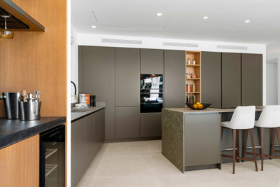 The villa features six bedrooms and impressive 3.5-metre ceilings on the main living level, creating an immediate sense of openness and depth. A spacious open-plan living and kitchen area connects directly to the pool and outdoor entertainment spaces, reinforcing the lifestyle appeal that defines a high-end villa in Marbella. The sleek modern kitchen is fully equipped with integrated Siemens appliances, extensive storage and a stylish dry bar with two wine fridges.