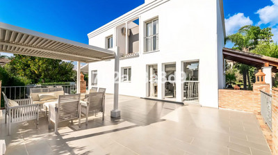 Situated in the exclusive residential enclave of Las Brisas, Nueva Andalucía, Marbella, this elegant villa enjoys a privileged position at the end of a quiet cul-de-sac, ensuring exceptional privacy and tranquility. The property occupies a generous 1,279 m² square plot, surrounded by mature landscaping and distinctive architectural details.