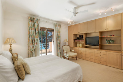 It offers five spacious and light-filled en-suite bedrooms, including a luxurious master suite with two dressing rooms and two private bathrooms. The interior layout is completed with formal reception rooms, a dining room, an elegant library, home cinema, games room with private bar, wine cellar, pantry, laundry room, and a closed garage with space for several vehicles.