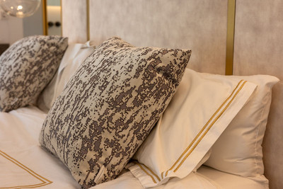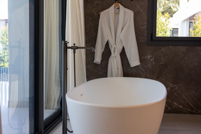 – The upper floor consists of three double bedrooms, two of which share a large bathroom. The master bedroom has an en-suite bathroom as well as a walk-in wardrobe and dressing area. In addition, this room has its own fireplace and two terraces, also overlooking the garden and pool.